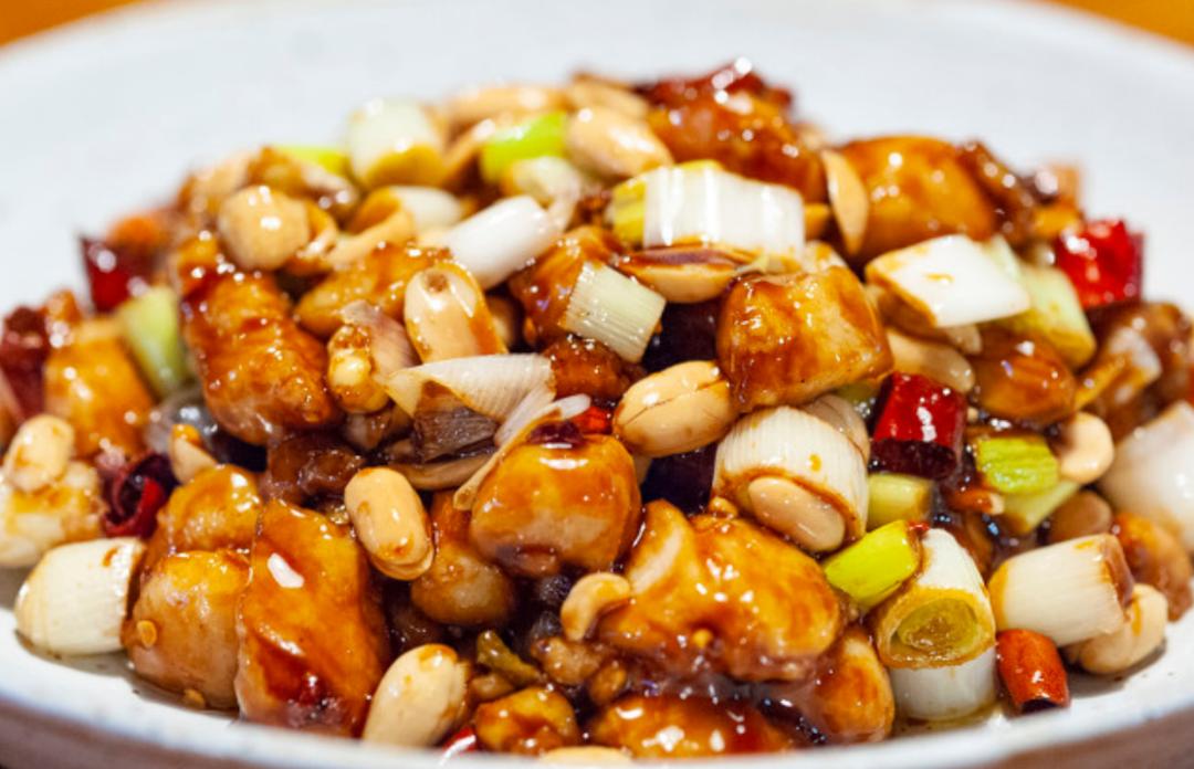 是川菜里的名菜,相传是清代四川总督丁宝桢所创,因其去世以后被追封太子太保,又被称为“丁宫保”,故而得名。最初宫保鸡丁的前身是以嫩鸡丁加小青椒一起炒,是咸鲜口的菜。后因小青椒是季节性蔬菜,丁宝桢府内厨师使用干红辣椒和花椒代替小青椒,并在原有基础上加入糖、醋,使其酸甜微辣,吃起来是特殊的“荔枝味儿”,再加上炸花生米,将鲜嫩酸甜辣香汇聚到同一道菜中。