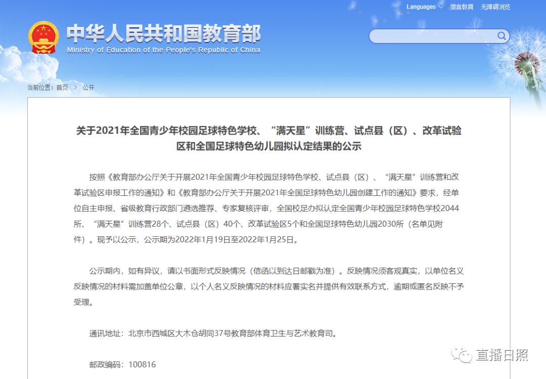 1月19日,教育部网站发布了《关于2021年全国青少年校园足球特色学校、“满天星”训练营、试点县(区)、改革试验区和全国足球特色幼儿园拟认定结果的公示》,公示期为2022年1月19日至25日。