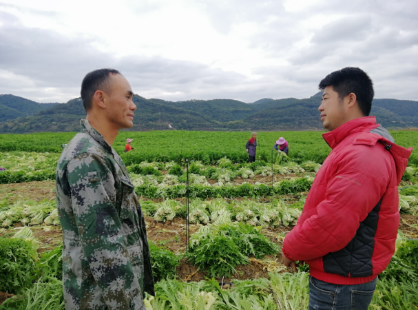 图为封开县江口街道封川村委会雪里蕻种植大户张志坚(左)与肇庆市·润加倍(封开县)农业发展有限公司负责人梁金源在基地了解情况。黄瑛居摄