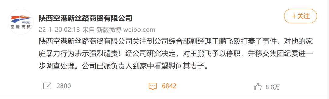 据报道,打人者是陕西空港新丝路商贸有限公司综合部副经理王鹏飞。目前,王鹏飞已被停职,移交公安机关处理。根据我国《反家庭暴力法》规定,加害人实施家庭暴力,构成违反治安管理行为的,依法给予治安管理处罚;构成犯罪的,依法追究刑事责任。相信随着公安部门介入调查,家暴者将受到应有惩罚、被打者获得正义抚慰,公众也将得到一个是非曲直的明确说法。