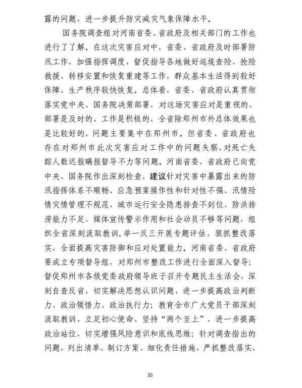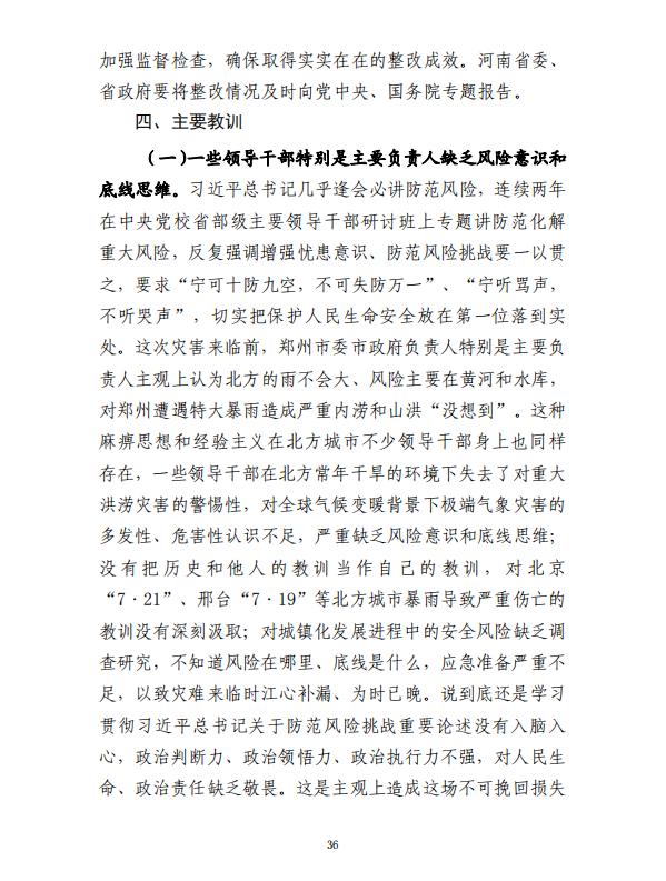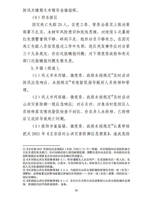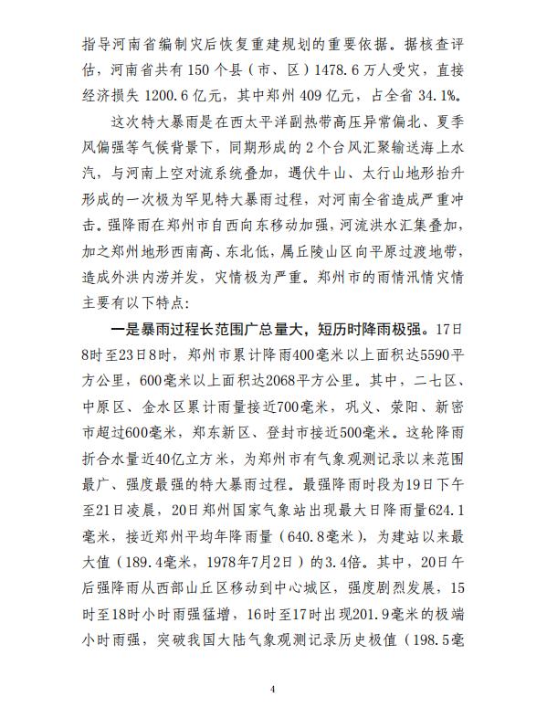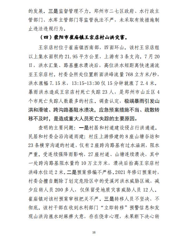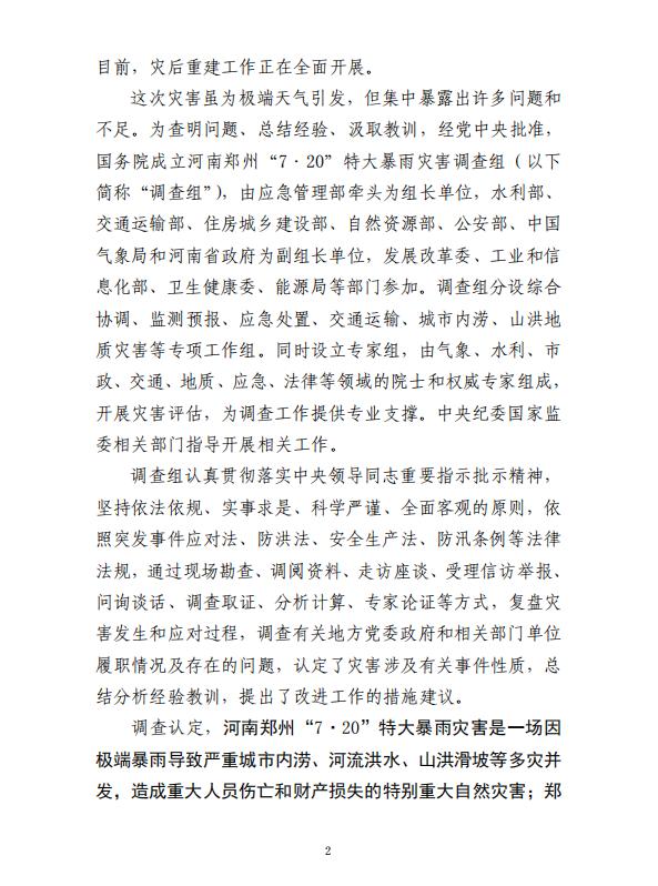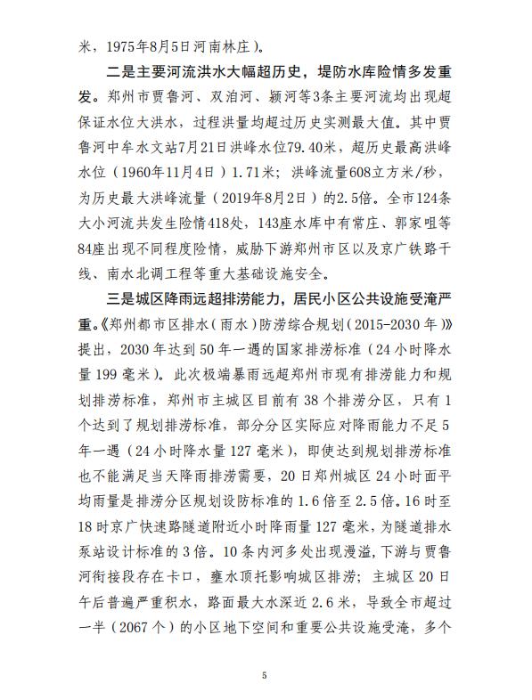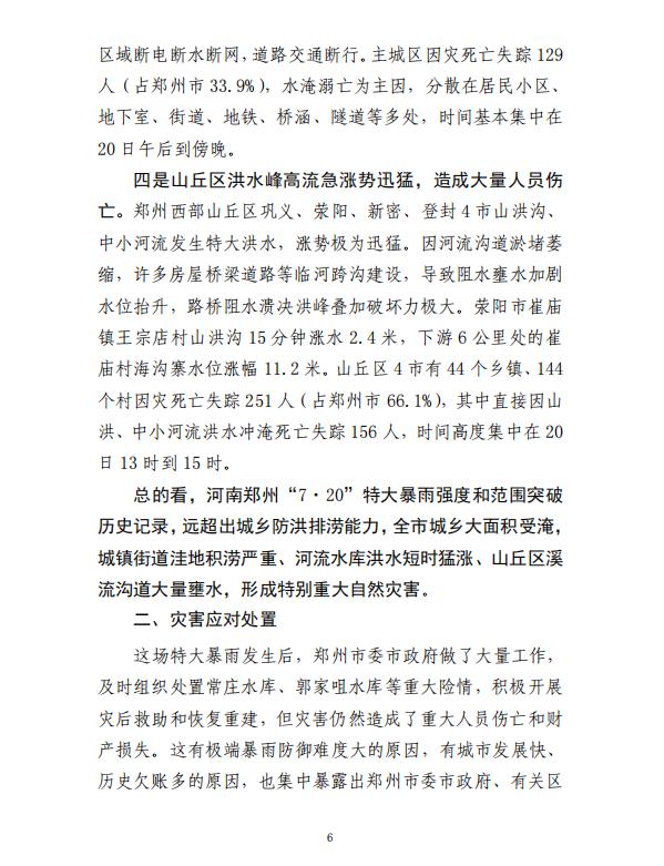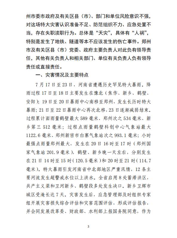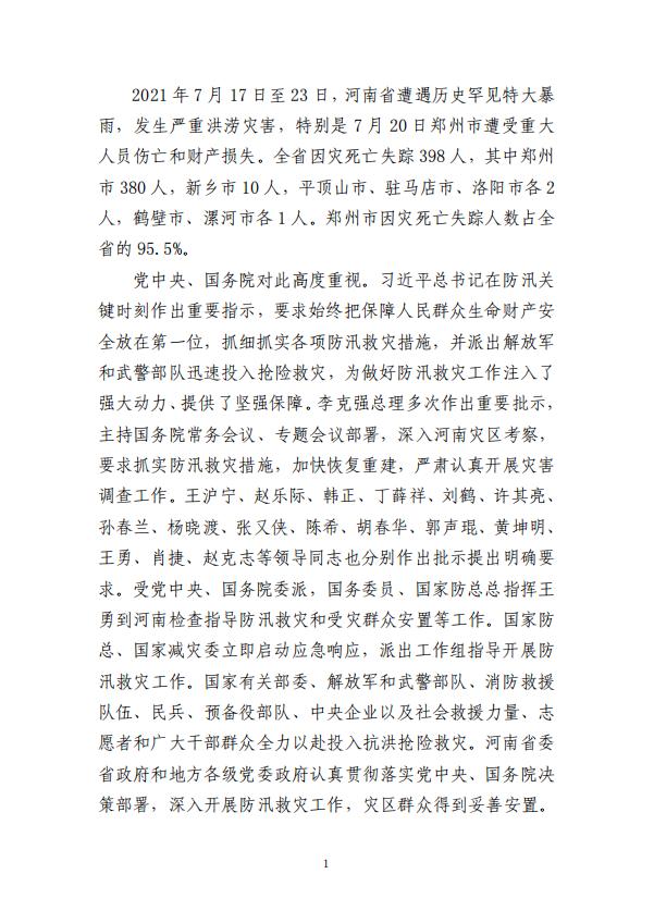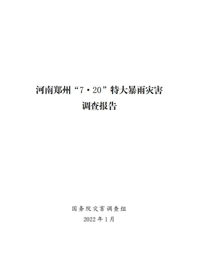 河南郑州“7·20”特大暴雨灾害调查报告全文如下