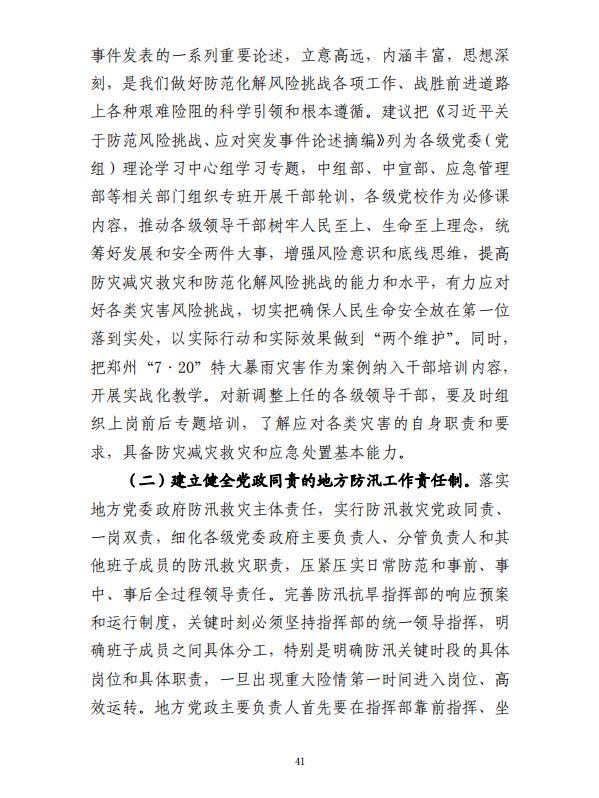 灾害发生后,河南省委、省政府认真贯彻落实党中央、国务院决策部署,组织地方各级党委政府深入开展防汛救灾工作,灾区群众及时得到妥善安置,生产生活较快恢复正常。党中央、国务院对灾害调查处理作出决定后,河南迅速召开省委常委会会议贯彻落实,进一步深入检查反思,深刻汲取教训,严格依规依纪依法对所有责任人惩处和问责,并对进一步统筹发展和安全、提升防范化解重大风险能力和管理治理能力作出部署安排。