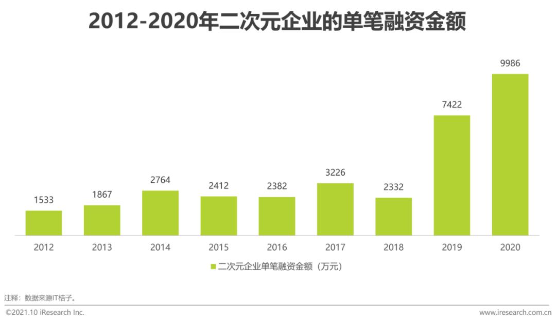 从另外一方面看,2012-2020年,单笔融资金额处于上升的趋势,说明待融资企业具备一定规模,整个二次元产业已经脱离了初步发展期,进入到成熟期。