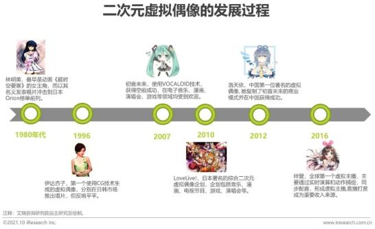 二次元虚拟偶像最早可以追溯到上个世纪的八十年代,在日本动画作品《超时空要塞》当中,女主角林明美是动画里,未来世界的虚拟偶像,她的高人气让厂商龙之子工作室,以林明美的名义,结合声优饭岛真理的声音发售了音乐专辑,并大获成功。21世纪,真正把虚拟偶像带到消费者的眼前,是日本音乐软件公司CRYPTON,运用VOCALOID技术开发而成的初音未来,自初音未来以后,诞生了一批虚拟偶像。虚拟偶像的厂商们不断探索变现渠道,逐渐形成了较为成熟的商业模式。