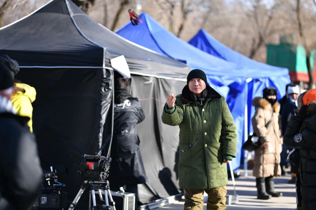 耿军穿着军大衣在片场耿军所走的人生道路,乍一听极为艰辛和传奇。