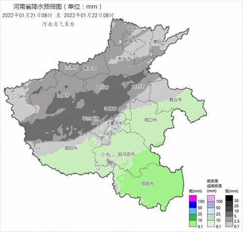 暴雪黄色预警:过去24小时,黄河以北和三门峡、洛阳、郑州、开封、平顶山、许昌、漯河、南阳八地区及商丘、周口、驻马店三地区西部部分县市出现5毫米以上降雪。预计22日08时到24日08时,上述地区降雪仍将持续,其中三门峡、洛阳、平顶山、漯河、许昌、南阳六地区和周口、驻马店两地区西部部分县市降雪量将达5毫米以上。