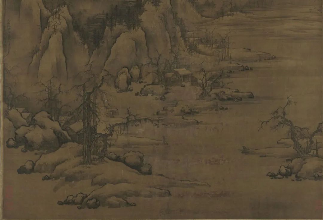 古人画雪,多寓万物肃杀、天地辽阔之意,无论是枯败的草木,还是被冰雪覆盖的山河,多让人心生萧瑟之感。正所谓是“千山鸟飞绝,万径人踪灭”,百里无飞鸟,千里无人烟。但是,纵然再萧瑟,人类也不可能绝然于天地之间。