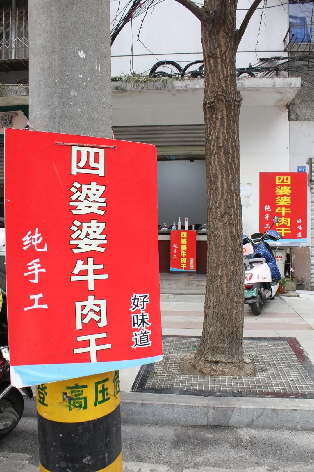 “说三道四”,第三代啤酒烤鸭的招牌年代感十足,凭着香味与门口的烤鸭勾买主,而四婆婆牛肉干的招牌就非常显眼又鲜艳了。“纯手工、好味道”,这两个简单直接的卖点如果真能完全做到,已经足够去形容一份好吃的牛肉干。