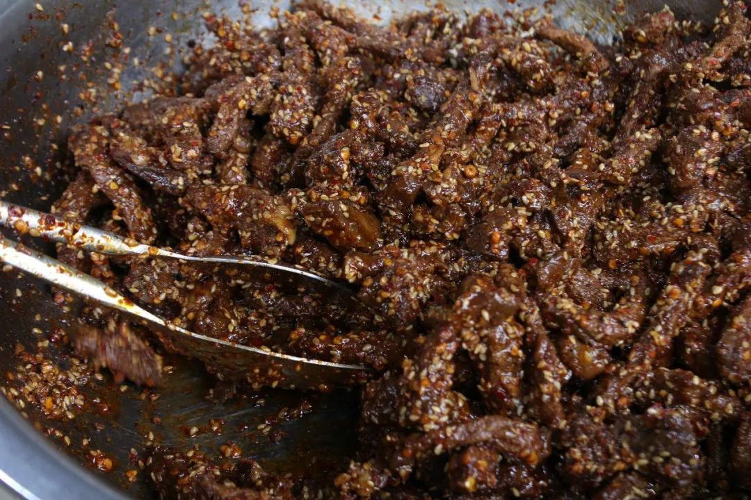 它家的肉不柴,属于比较油润的那种,麻辣、香辣、五香三种味,每根牛肉干都裹满了调料,在白芝麻的点缀下,油亮亮的口水跟到流,越吃越香。