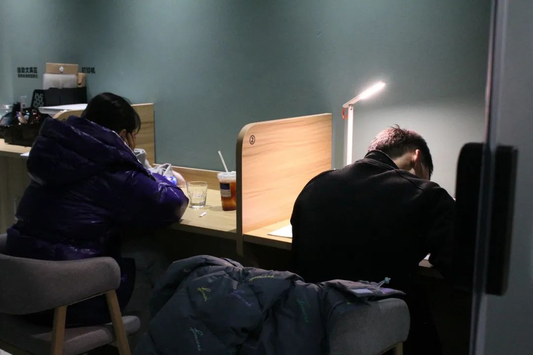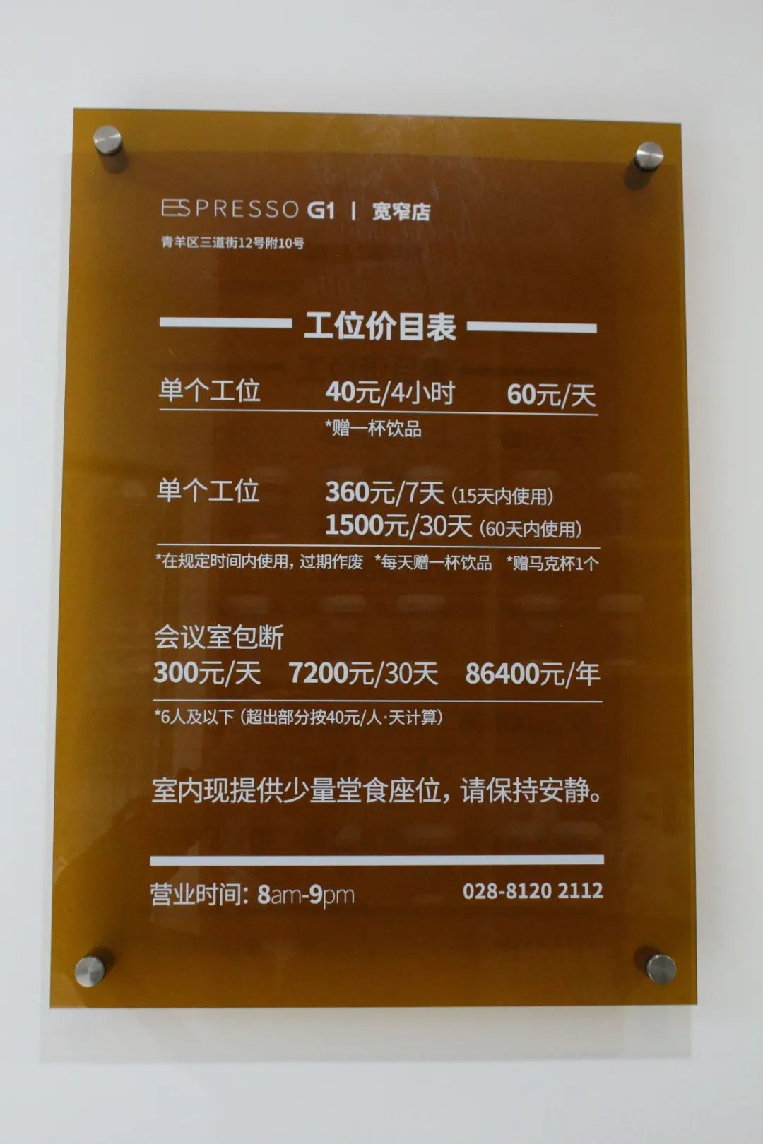 门口的各种标语都直击上班族的内心:上班,与咖啡同进退,共存亡。店内的布置也尤为适合办公,颜色偏冷色调,座位很多,还专门设有工位的价目表,仿佛在向我说着:“打工人咖啡,就该好好来打工。”来这家咖啡馆打卡的,应该用的不是大众点评,而是钉钉。