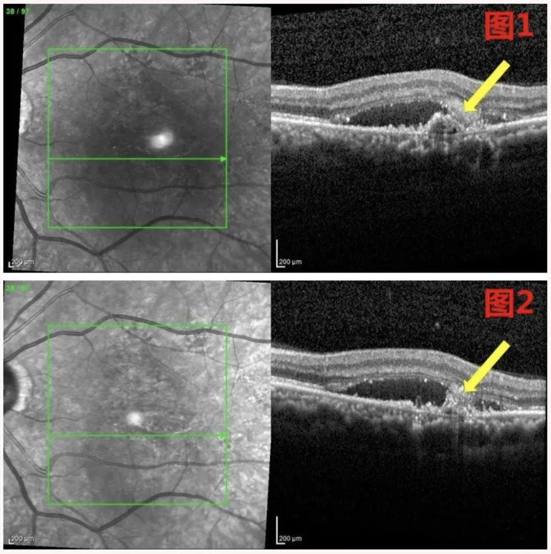 ▲注:与治疗后第3周(图1)相比,治疗后第4周(图2)黄斑区渗出减少,细胞病变较前减轻(黄色箭头)