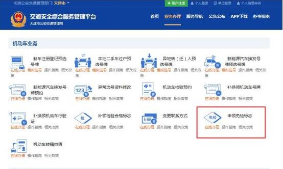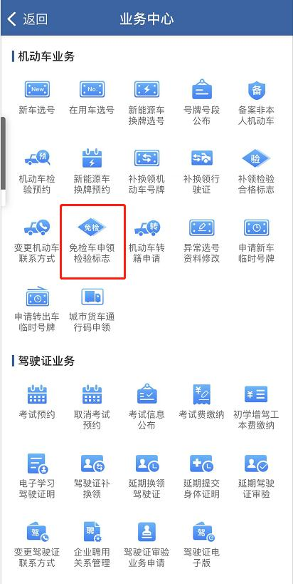 步骤2:在“业务办理”页面“机动车业务”中,选择“申领免检标志”选项。