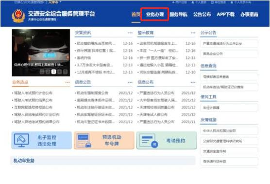 步骤1:登录“交通安全综合服务管理平台(https://tj.122.gov.cn)”,点击首页“业务办理”选项。