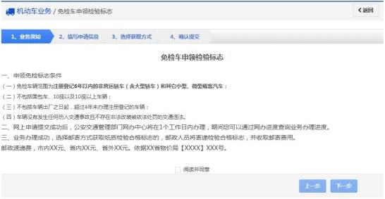 步骤3:进入“申领免检标志”业务界面,在认真阅读“免检车申领检验标志业务须知”后,勾选“阅读并同意”,并点击“下一步”按钮。