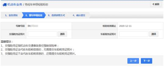 步骤4:在“申领信息”页面中,确认个人名下需要申领免检标志的车辆号牌号码、检验有效期止等信息,并依次上传交强险凭证和车船税凭证照片,随后点击“下一步”。