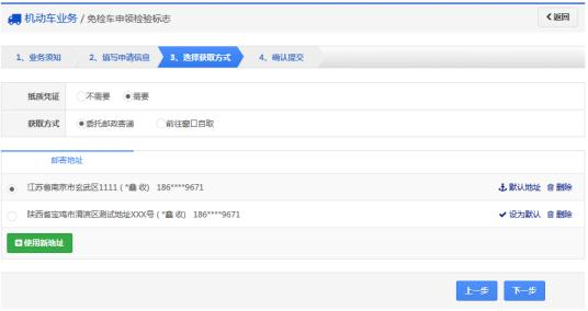 步骤5:在“选择获取方式”页面中,勾选“不需要”纸质凭证并点击“下一步”。公安交管部门在此提示,检验标志电子凭证与纸质凭证具有同等效力,车主在申领检验标志后可下载在手机上或自行打印放于车内,以便驾车上路时使用。