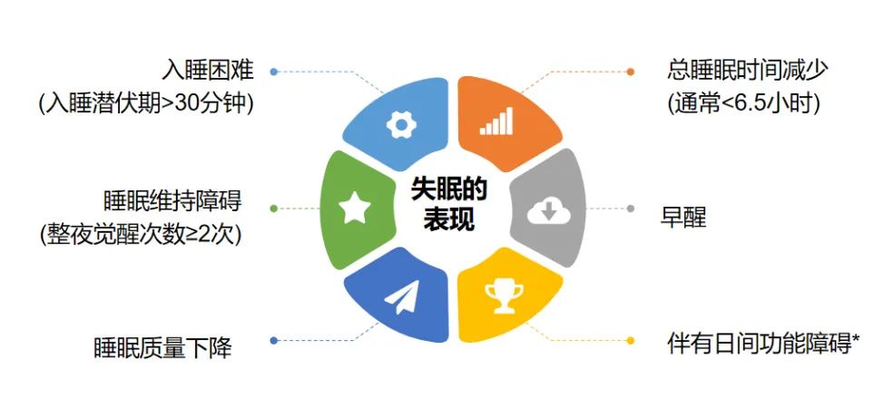 睡眠质量下降和总睡眠时间减少(通常少于 6.5 小时),同时伴有日间功能障碍、