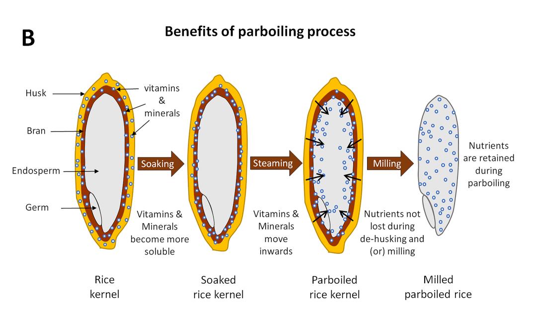 ▲蒸煮过程中米糠、谷壳中的水溶性营养素渗透到米粒中,因此,保留的营养成分更完整[5]和白米相比,蒸谷米保留了更多营养成分。因为蒸煮过程中米糠、谷壳中的水溶性营养素渗透到米粒中[5]。
