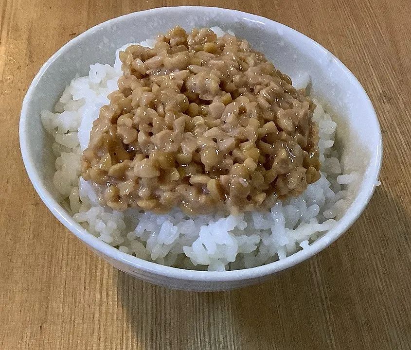 ▲米饭配纳豆。By Qbwr8296 .wikimedia.org比如日本的研究中,白米饭的GI是100,白米饭20g黄豆粉、白米饭+30g纳豆吃时,GI为68[6]。