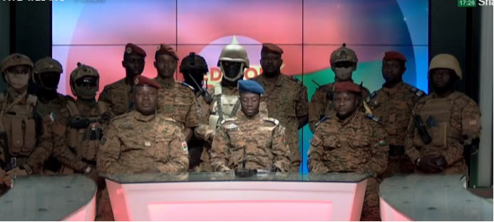 当地时间1月24日下午,布基纳法索国家电视台播出消息,由桑道戈·达米巴中校率领的一群士兵宣布,保卫和恢复爱国运动 (MPSR) 夺取了政权。他们宣布暂停宪法,解散布基纳法索政府和国民议会,关闭陆地和空中边界,并在全国范围内实施从晚9时至次日凌晨5时的宵禁。