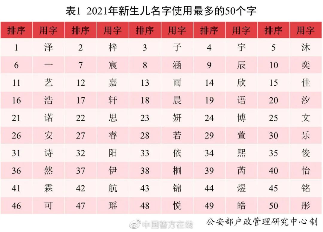 2021年出生并已经进行户籍登记的新生儿名字中,使用频率最高的50个字依次为泽、梓、子、宇、沐等。与2020年相比,汐、芮、霖、航等字受到青睐。