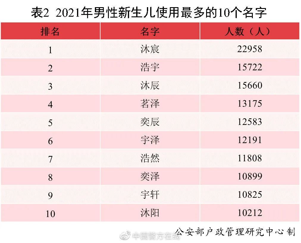 2021年出生并已经进行户籍登记的男性新生儿中,使用频率最高的10个名字依次为:沐宸、浩宇、沐辰、茗泽、奕辰、宇泽、浩然、奕泽、宇轩、沐阳。与2020年相比,除浩宇、奕辰、宇轩外,其余名字首次进入前十,其中“沐宸”使用人数达到2.3万,登顶榜首,成为男性新生儿名字首选。