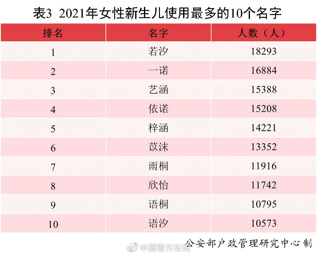 2021年出生并已经进行户籍登记的女性新生儿中,使用频率最高的10个名字依次为:若汐、一诺、艺涵、依诺、梓涵、苡沫、雨桐、欣怡、语桐、语汐。与2020年相比,若汐、艺涵、苡沫首次进入前十,其中“若汐”使用人数达到1.8万,登顶榜首,成为女性新生儿名字首选。