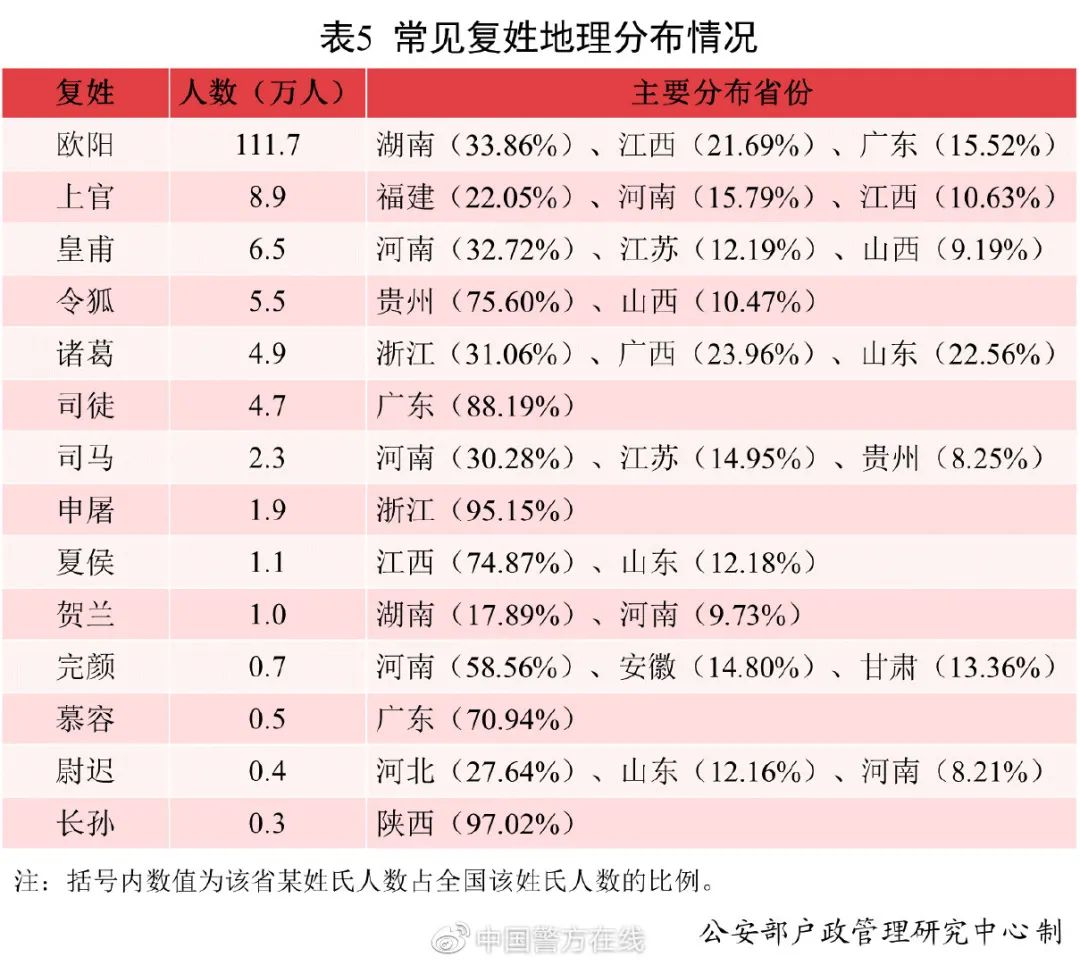 常见复姓“聚居”的特点非常突出,复姓人口在个别省份的分布较为集中。