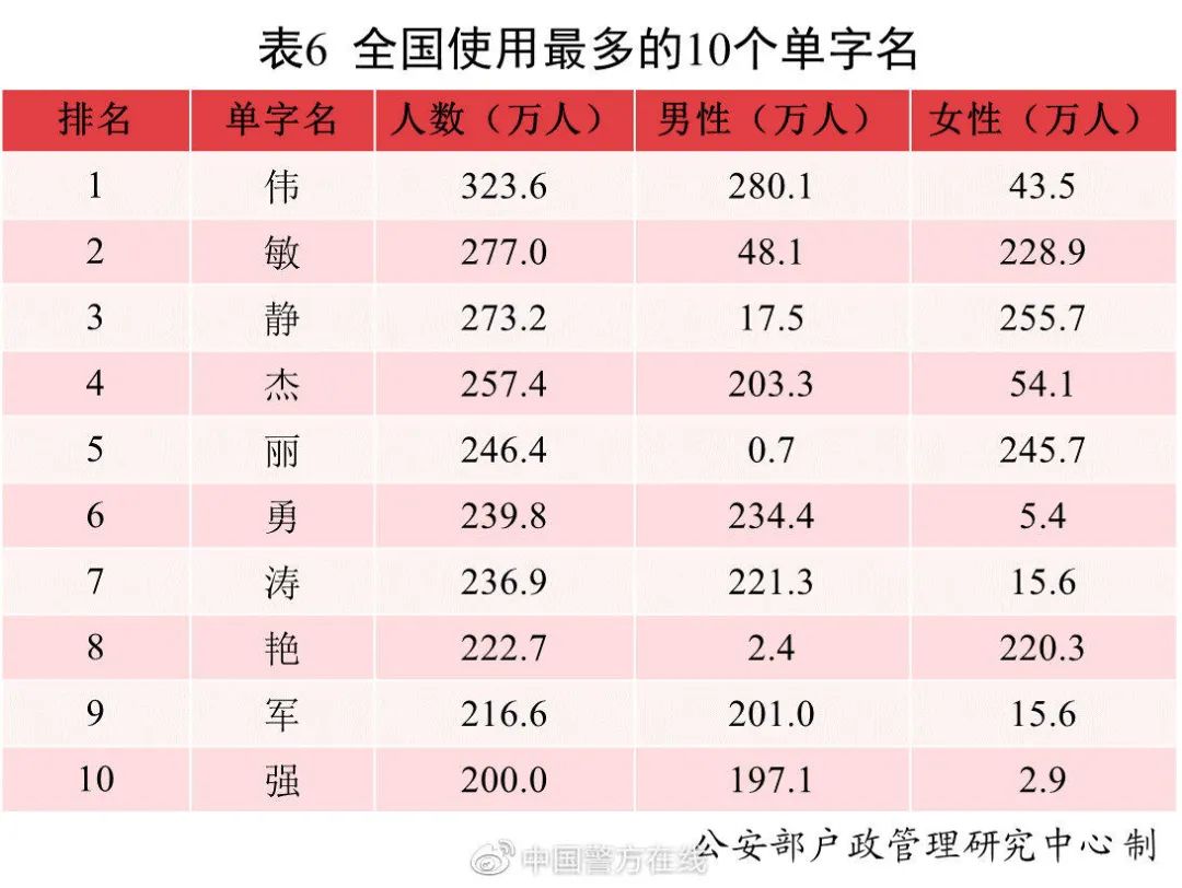 全国户籍人口中,使用频率最高的10个单字名依次为:伟、敏、静、杰、丽、勇、涛、艳、军、强。其中“伟”名列榜首,使用人数为323.6万。