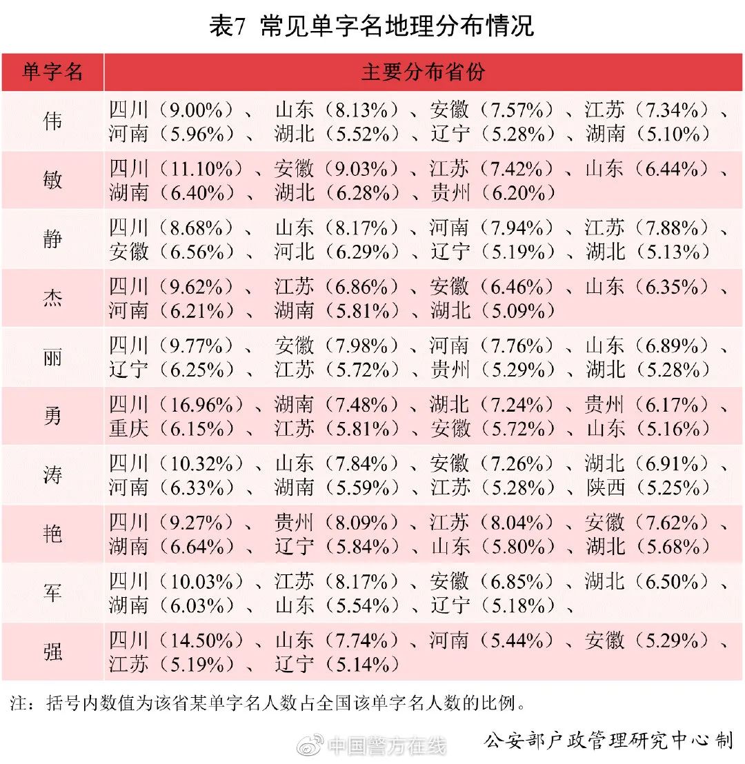 全国使用最多的10个单字名相对集中分布在四川、山东、安徽、河南、江苏、湖北、湖南、辽宁等省份。