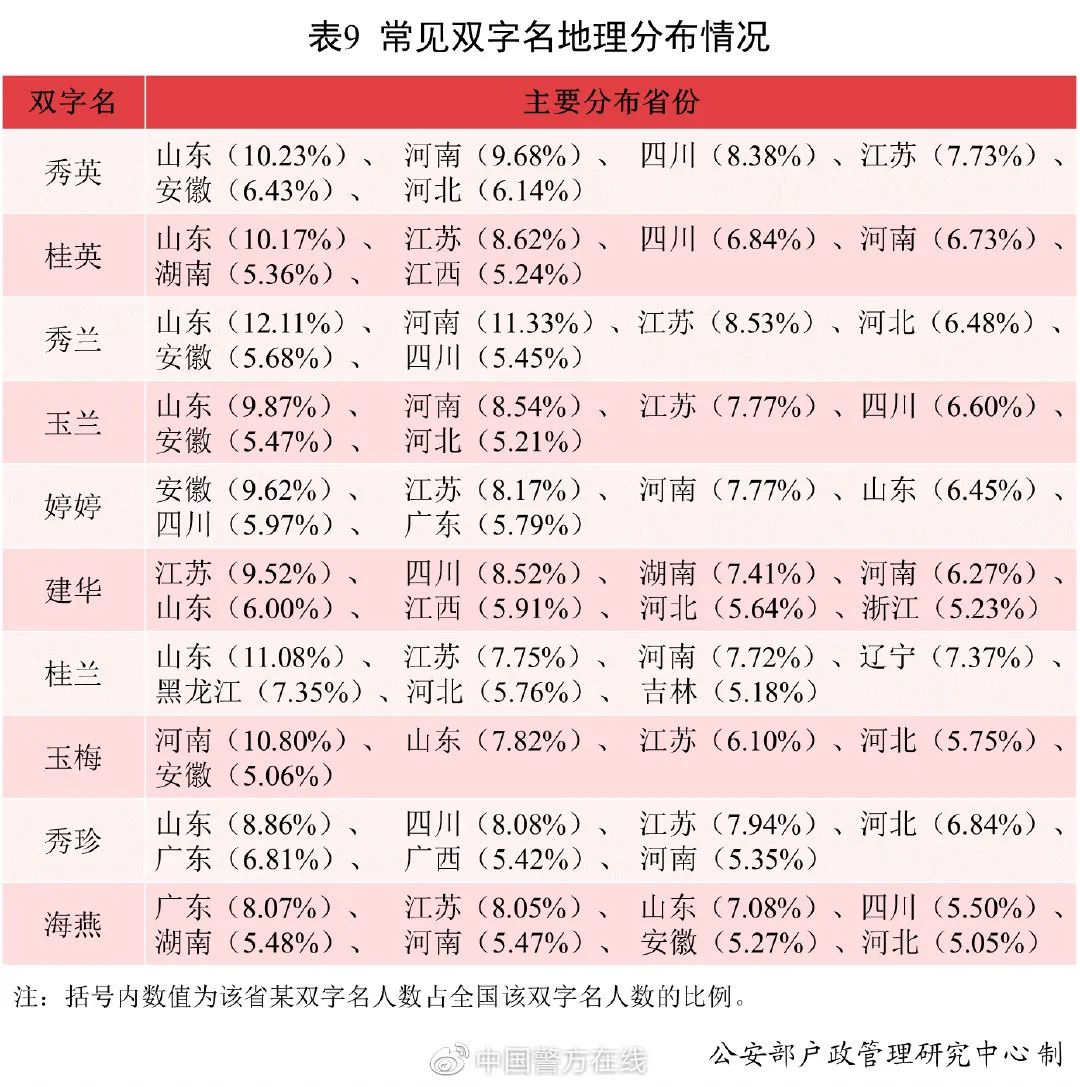 全国使用最多的10个双字名相对集中分布在山东、河南、四川、江苏、河北、湖南、安徽等省份。