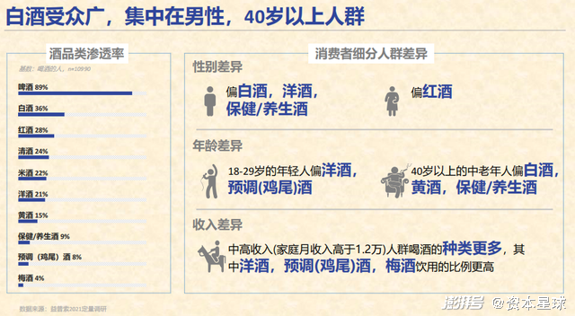 Ipsos发布的《2021年白酒消费趋势》显示,白酒的受众虽然广泛,但是用户主要集中在40岁及以上的中老年人群,18-29岁的年轻人更偏爱洋酒和预调酒。而且,洋酒、黄酒、清酒、红酒等品类分别从商务应酬、同事聚会、一人独酌、婚宴、政务应酬等多个场景挤占白酒份额。
