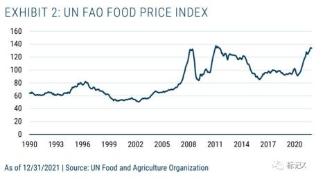 第四,包括石油、重要金属、食物等商品价格出现大范围涨价。此外,联合国的全球食品指数创出历史新高(见图2)。