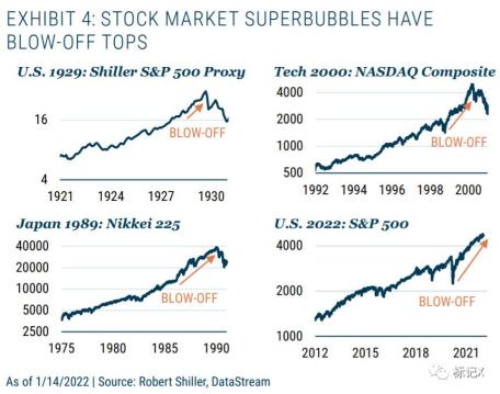 市场有多疯狂?超级泡沫在崩溃前往往会出现加速冲高的阶段,其速度是过往牛市平均增速的两到三倍。2020年以来这轮泡沫的走势与过往如出一辙(见图4)。