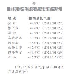 那再进一步扩大数据库范围,在国家级气象观测站数据的基础上,加入当地自动气象站数据。根据根河市气象局提供的自动气象站数据,根河市各地历史极端最低气温(表 1)并没有低于-50℃的数据。