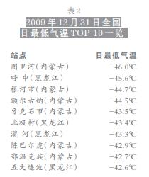 根据国家气候中心数据(表 2),2009 年 12 月 31 日全国“最冷”的十个观测站有 6 个在内蒙古,4 个在黑龙江。这一天,内蒙古最冷的呼伦贝尔市图里河站为-46℃,黑龙江呼中站为-45.6℃。