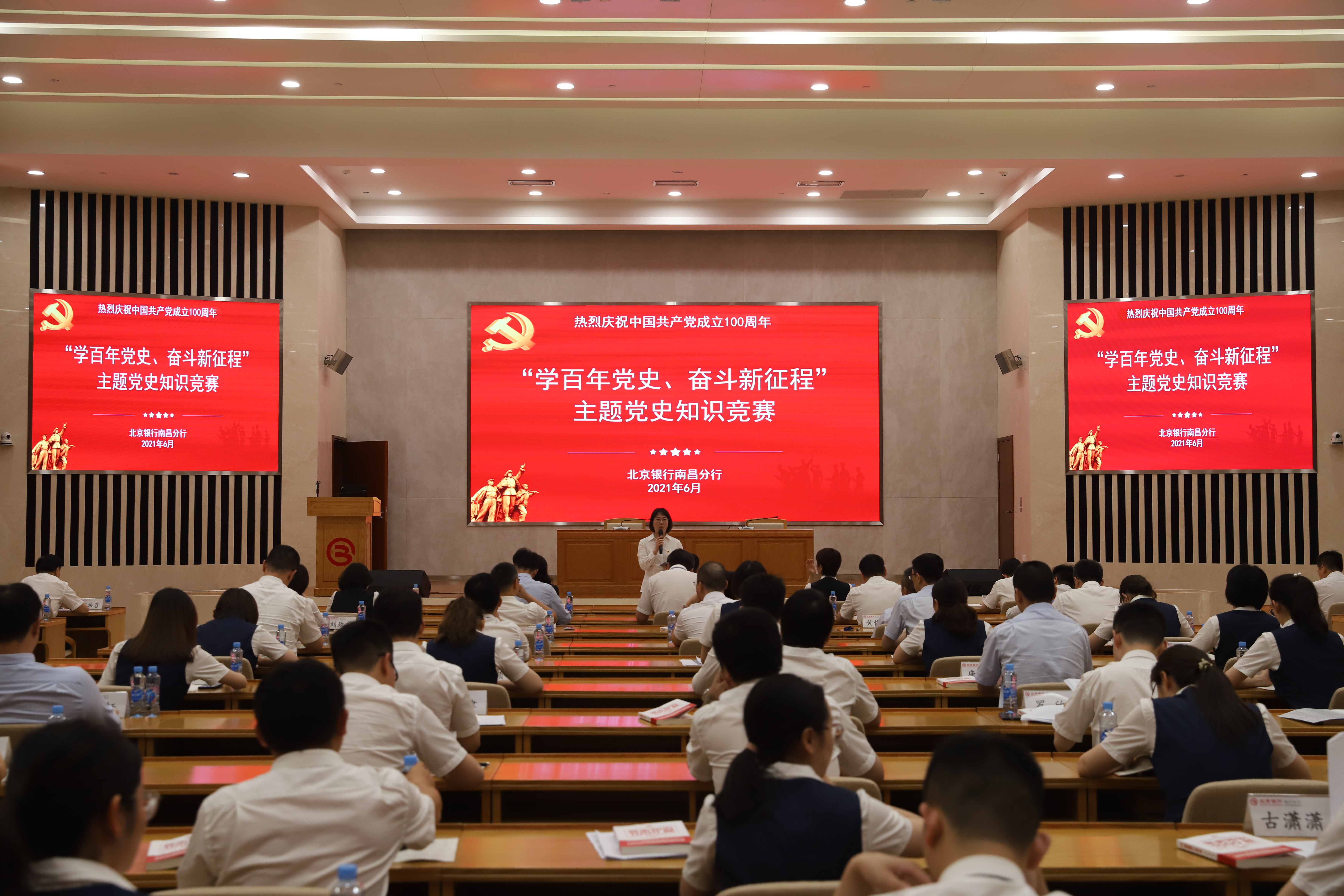 “重温党史,是加强党的建设一项重要经验”。北京银行南昌分行认真落实省委、省政府和总行党委统一部署,第一时间召开了全行党史学习教育动员部署会,成立了以党委书记、行长为组长的领导小组,党史学习教育贯穿全年,月月有安排。开展了“学百年党史、奋斗新征程”主题征文与知识竞赛,举办了“华章启航”读书班,组织行领导班子、党支部书记、分支行(部门)负责人及业务骨干代表 50 余人进行“红色走读”,深入中国工人运动的摇篮——萍乡安源红色教育基地接受革命熏陶,党委书记带头讲专题党课。此外,还举办了“伟大征程——中国共产党历史图鉴展览”等多种形式的活动。