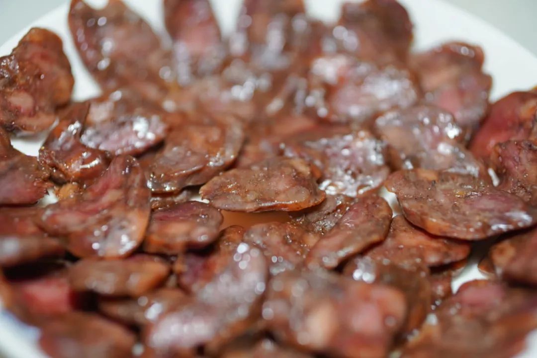 晒干的香肠上锅蒸熟,切成薄片,瘦肉多汁、肥肉晶莹,猪肉吸收了调料的精髓,越嚼越香,舌尖最先感受到的是咸,随即而来的便是鲜甜味的刺激,两种味道不起冲突,融合得刚刚好。03 / 皮冻儿