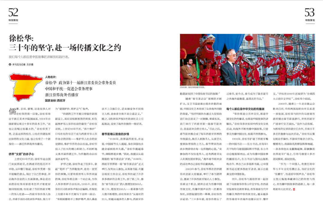 “1986年,我移居西班牙。在这里,中国春节无人提起,身在异国他乡就会感到格外失落。”徐松华提起春节,满眼都是乡情,“因此,我提议从最简易的‘春节茶话会’开始。”1988年,西班牙侨界第一场“春节茶话会”正式举行,仅有32人参加。从筹备节目、布置会场到主持会议,徐松华担起了许许多多琐碎的会务工作。到了第二年,参加“春节茶话会”的人数增加到100人;第三年,增加至300人……看着参与的人数不断增加,徐松华坦言“从最初的32人,到越来越多的人参与,西班牙侨胞重新找回了中国传统节日的氛围!”
