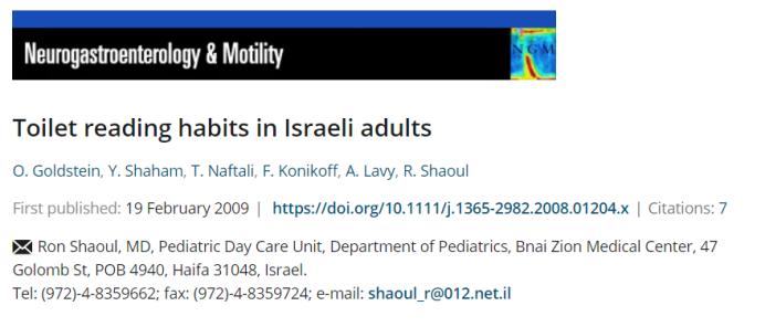 这项研究于2009年发表在Neurogastroenterology & Motility(神经胃肠病学和运动学)期刊上,文章名为“Toilet reading habits in Israeli adults”,中文译作“以色列成年人的厕所阅读习惯”。