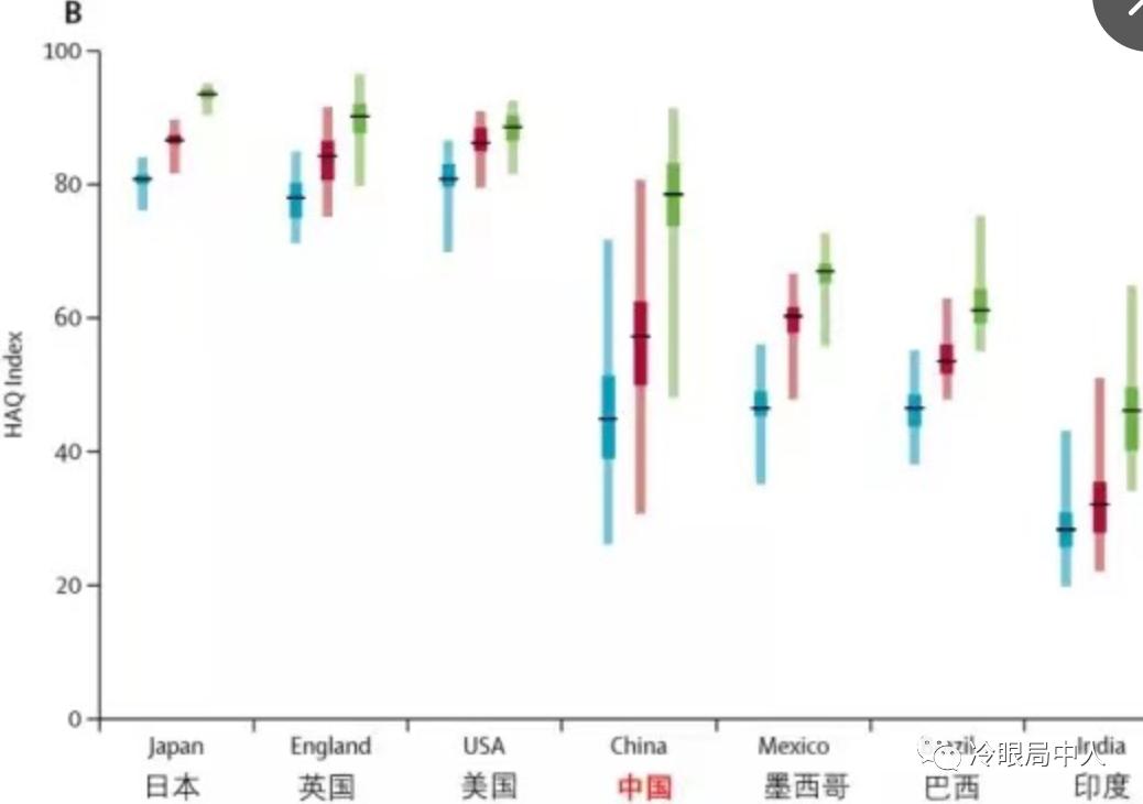 上图中颜色表示不同年代,蓝色是90年代、红色00年代,绿色是2016年,柱形图表示每个国家不同区域的医疗水平得分跨度。在上一篇文章中,我们就谈到了中国的防御薄弱环节之一在于地区医疗水平、资源、5G网络资源不平均、行政管理水平差异大。总体表现在,东西部差距巨大、城乡差距巨大。