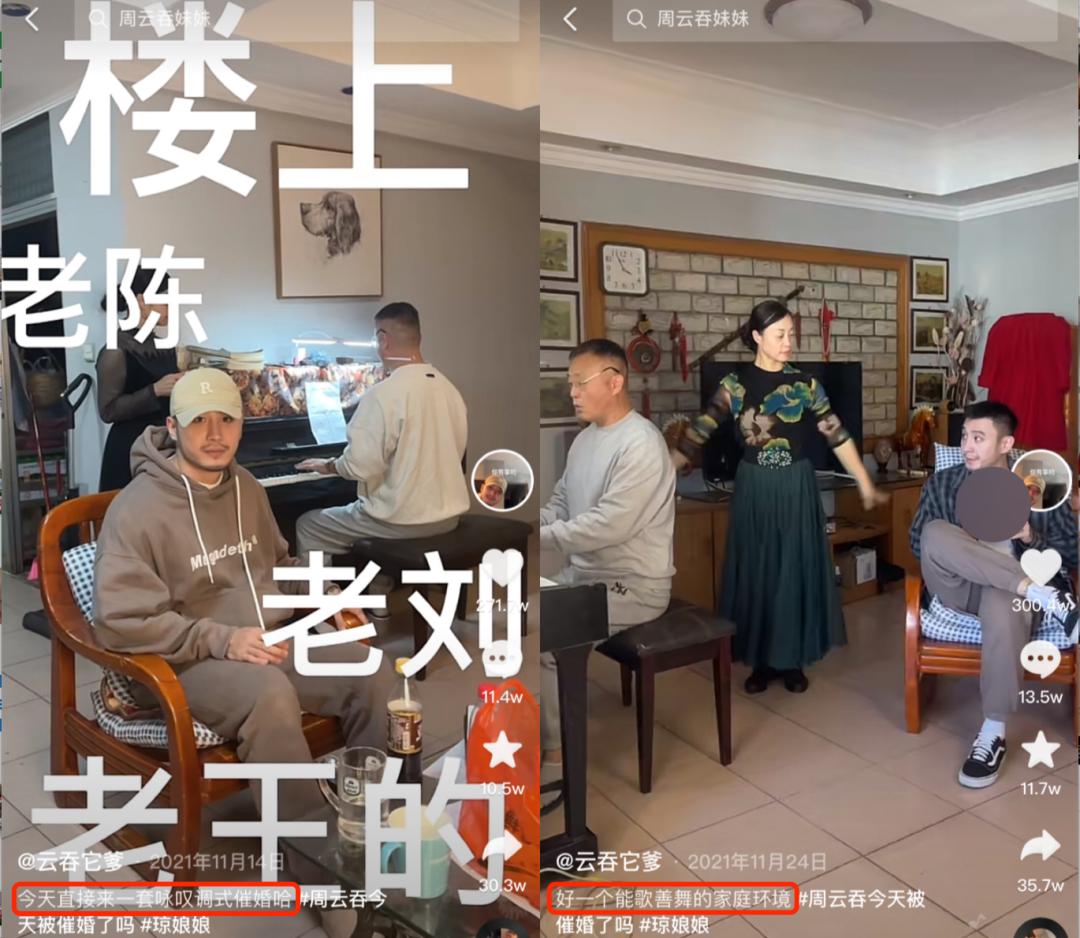 张艺观察到,和能言善辩的催婚主力军妈妈相比,催婚账号里的爸爸通常是“看戏+帮忙”的形象。比如“云吞他爹”里的周爸爸,常常在妈妈催婚时进行伴奏。