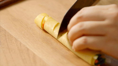 把干豆腐卷斜切成2厘米宽的段,摆在盘子边缘。看,新年的感觉一下子就出来了!