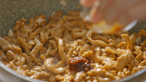 起油锅,中火把肉丝煸至变色,加入葱蒜末爆香。传统做法要另起一锅爆香酱料,在家里做可以简化步骤,直接加入豆瓣酱、甜面酱、糖、蚝油、料酒,翻炒均匀。