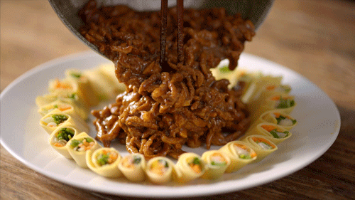 等酱汁均匀裹在肉丝上,就可以出锅装盘了。腌肉加炒菜,20分钟就完成,效率顶呱呱!金灿灿的一圈“黄金卷”围着红澄澄的肉丝,这盘京酱肉丝,太出彩了!