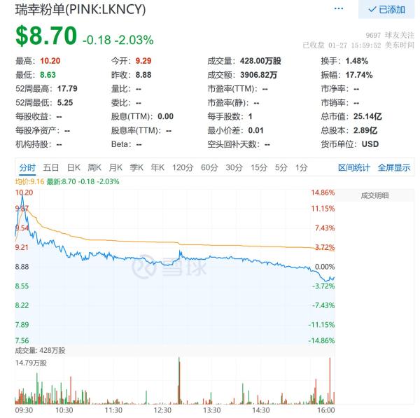 债务重组消息传出后,1月27日,瑞幸咖啡在美股粉单市场(为不满足挂牌上市条件的公司提供服务的场外交易市场)盘中涨超10%,一度升破10美元/股,收跌2.03%,报收8.70美元。