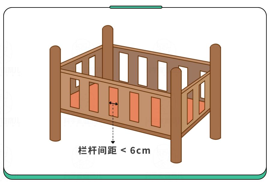 宝宝婴儿床的栏杆间距不超过6厘米,床围栏的高度至少超过宝宝身高一半以上。