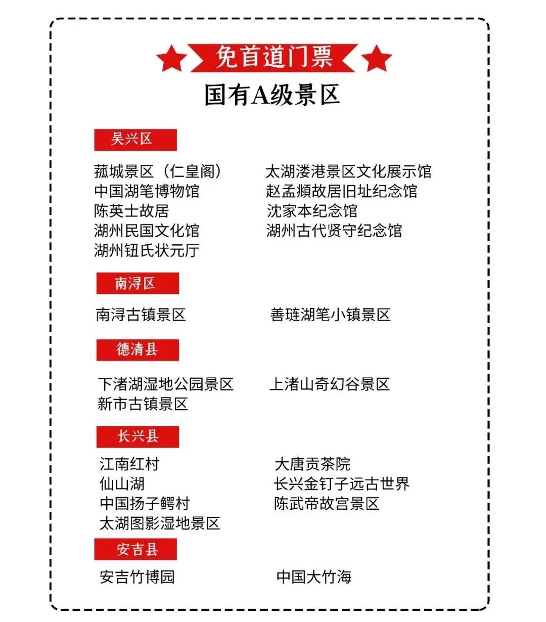 全市免费游国有A级景区名单这个春节,留在湖州,玩在湖州。你的美好假期都将被湖州承包,1亿元新春暖心券等你来领!全市国有A级景区畅快游!第一波新春暖心券将于1月30日上午9点正式开始。
