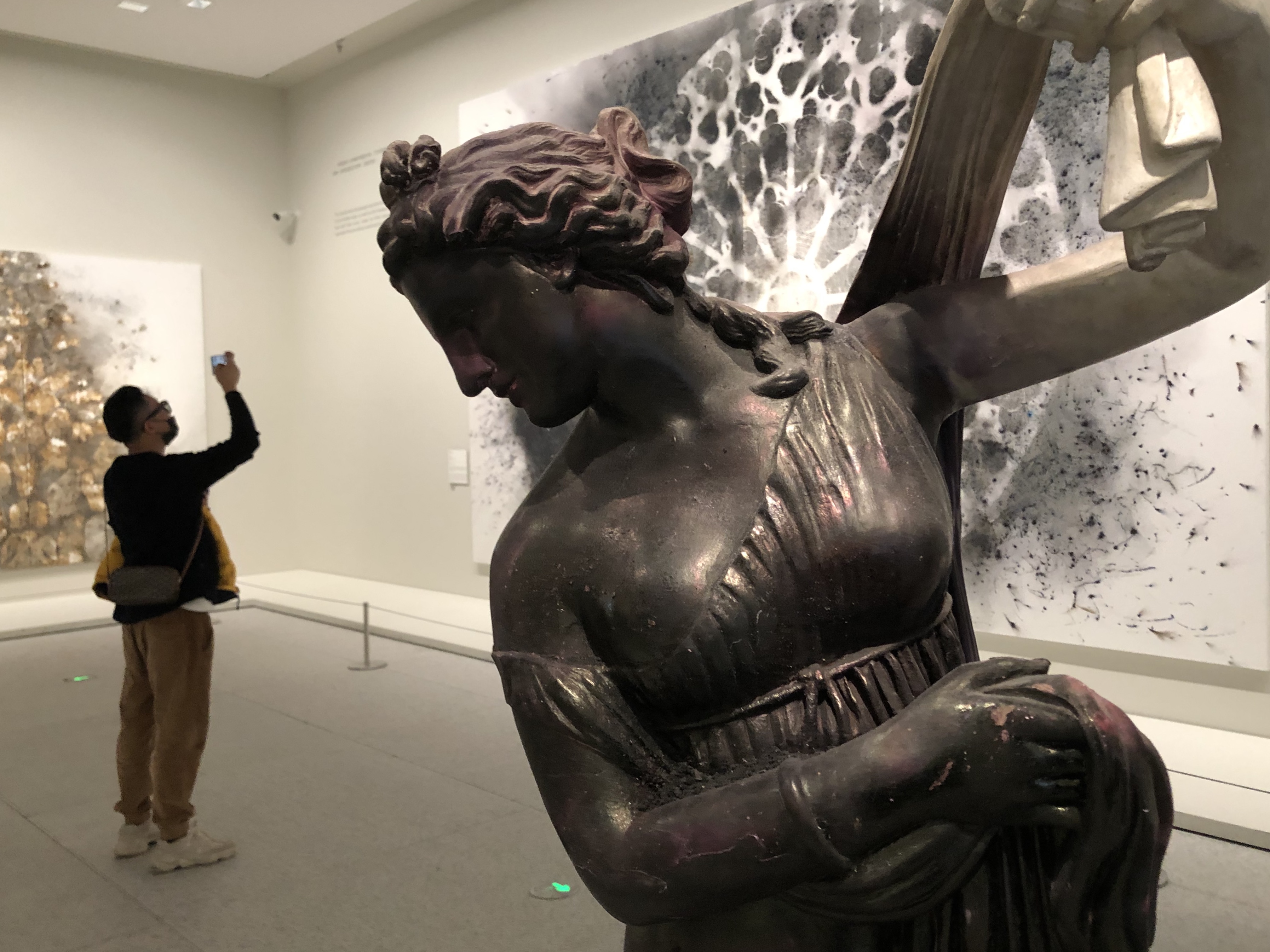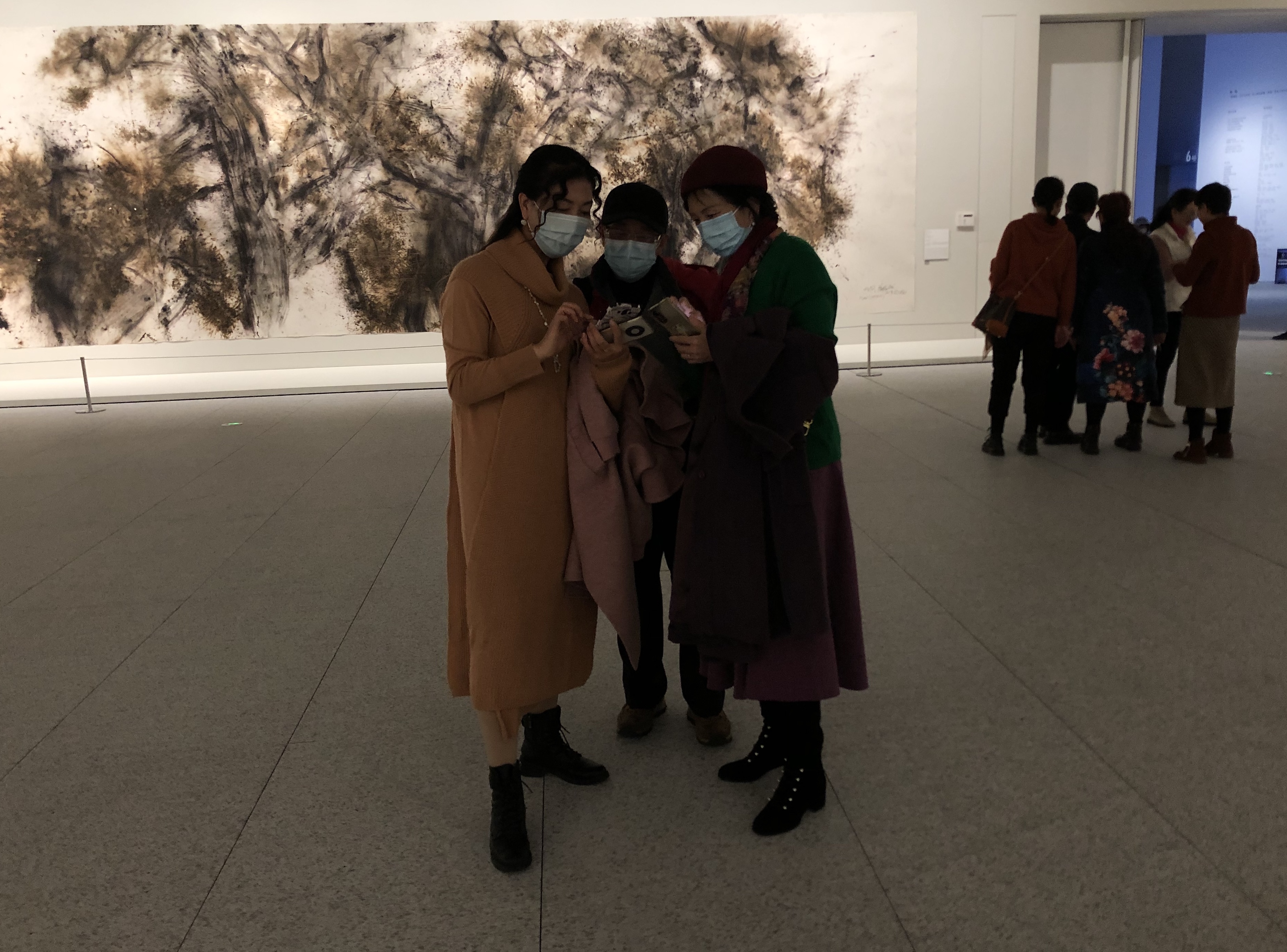 这些观众对拍照背景有自己的想象、偏好和独特眼光。虽然价值标准不同,但这些观众挑选作品的苛刻程度,也许不下于策展人和批评家。一旦选定某一幅作品,她们会呼唤同行朋友摆好姿势,用不同色彩的纱巾呼应蔡国强选择的颜料,并指示摄影师从特定且新奇的角度拍摄。她们的人生经验早已转变成展示自我的强烈渴望,以及足以与渴望相匹配的信心。她们气场强大,足以统治那些宽阔和高挑的展厅。有时候我觉得她们是艺术家本人的化身,正在与视觉艺术的历史叙事对话。