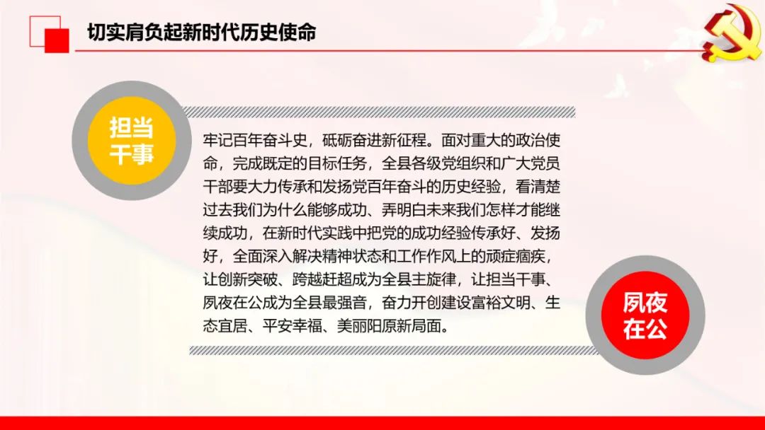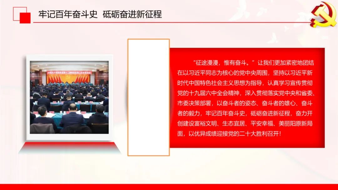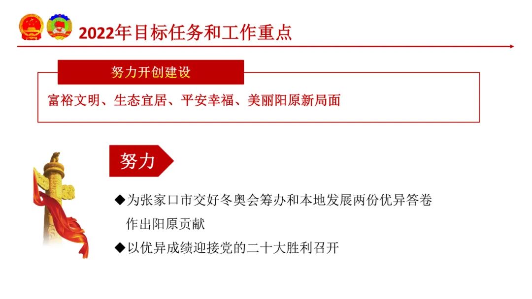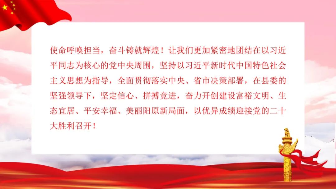 县委、县政府发出号召,要以奋斗者的姿态、奋斗者的雄心、奋斗者的毅力,牢记百年奋斗史,砥砺奋进新征程,奋力开创建设富裕文明、生态宜居、平安幸福、美丽阳原新局面,以优异成绩迎接党的二十大胜利召开!这是新一届县委顺应大势作出的重大决策部署,是立足新发展阶段、贯彻新发展理念、融入新发展格局,全方位推进高质量发展的纲领性文件,是向全县人民作出的庄严承诺,更是奋进新征程、再铸新辉煌的动员令。